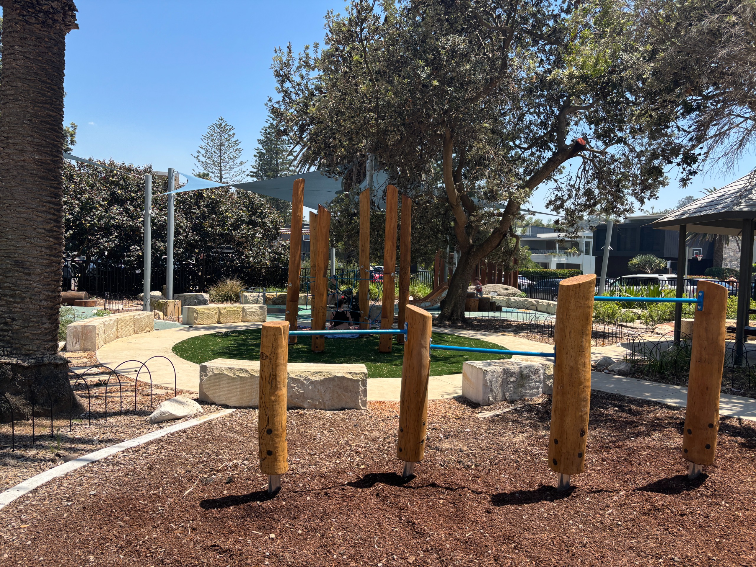 Safety and comfort were paramount in the playground's design. New shade sails provide protection from the sun, while a secure fence ensures children can play freely without wandering near busy roads. The thoughtfully landscaped area features elegant sandstone seating, lush grassed spaces, a soft safety surface, improved pathways, and convenient BBQ facilities.